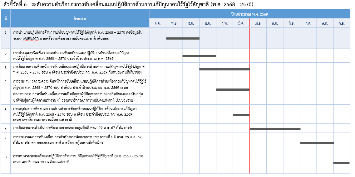 | มีการติดตามความคืบหน้าการขับเคลื่อนแผนปฏิบัติการด้านเพื่อการแก้ปัญหาคนไร้รัฐไร้สัญชาติ พ.ศ. 2568 - 2570 รอบ 6 เดือน เสนอ คณะอนุกรรมการเพื่อขับเคลื่อนการแก้ไขปัญหาผู้มีปัญหาสถานะและสิทธิของบุคคลในกลุ่มชาติพันธุ์และผู้ติดตามแรงงาน (มีรองเลขาธิการสภาความมั่นคงแห่งชาติเป็นประธาน | ไม่ผ่าน |