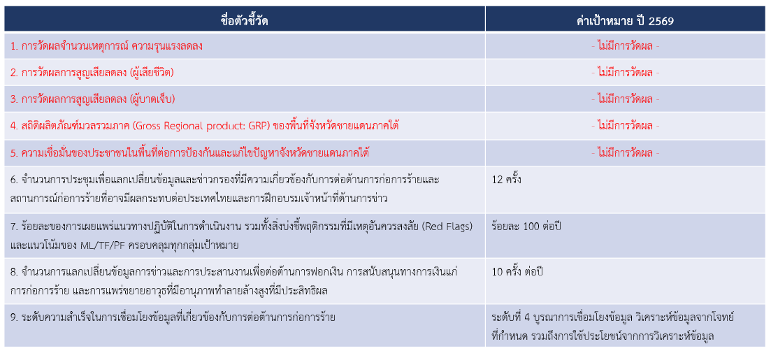 จำนวนตัวชี้วัดในนโยบายและแผนความมั่นคงที่ สมช. รับผิดชอบบรรลุเป้าหมายที่กำหนด เป็นการวัดผลตามจำนวนตัวชี้วัดของนโยบายและแผนความมั่นคงที่ สมช. รับผิดชอบบรรลุเป้าหมายขั้นสูง จำนวนทั้งสิ้น 12 ตัวชี้วัด จากทั้งหมด 17 ตัวชี้วัด ทั้งนี้ ไม่วัดผล นยบ.ที่ 5 การป้องกันและแก้ไขปัญหาจังหวัดชายแดนภาคใต้ (ตัวชี้วัดย่อยลำดับที่ 1 – 5) เนื่องจากมีการประเมินผลตามมาตรการปรับปรุงประสิทธิภาพในการปฏิบัติราชการของ สมช. ประจำปีงบประมาณ พ.ศ. 2569 - 2570 ปรากฎในตัวชี้วัด “สถิติเหตุการณ์ความรุนแรงและความสูญเสียจากสถานการณ์ความมั่นคงในพื้นที่จังหวัดชายแดนภาคใต้ลดลง” ค่าเป้าหมายระยะ 5 ปี แบ่งออกเป็น ปี 2566 (ร้อยละ 50) ปี 2567 (ร้อยละ 60) ปี 2568 (ร้อยละ 70) ปี 2569 (ร้อยละ 80) ปี 2570 (ร้อยละ 90)