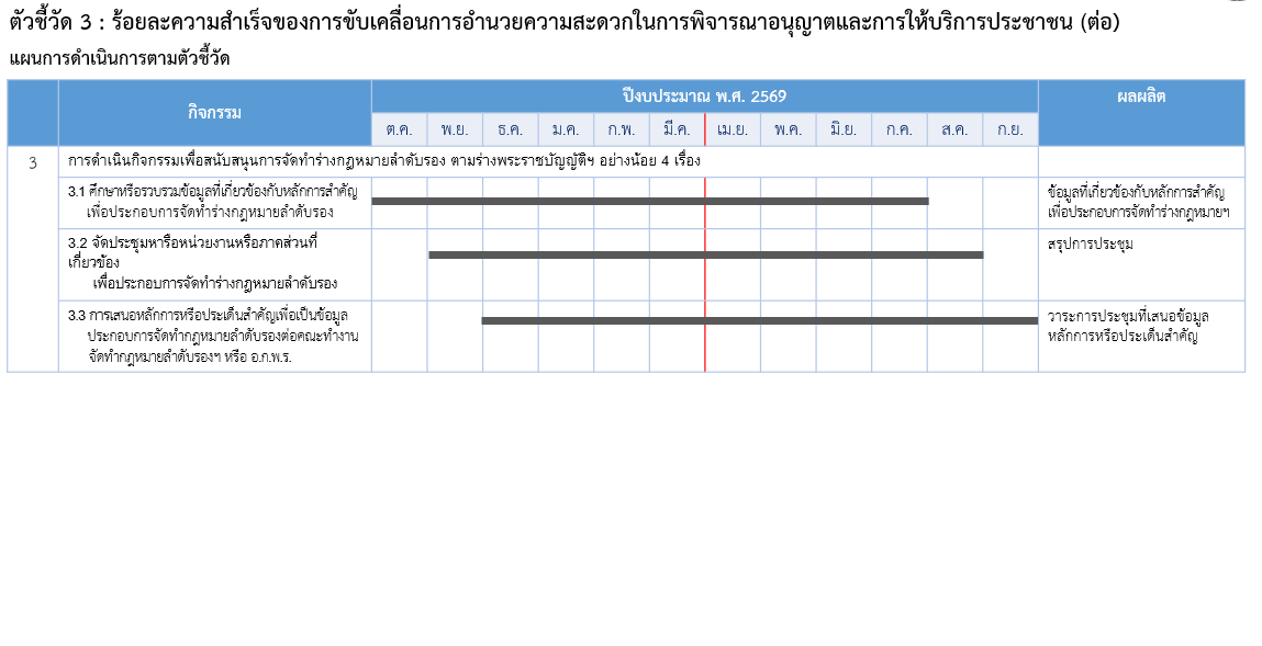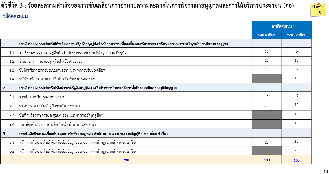 • เป็นตัวชี้วัดเพื่อขับเคลื่อนการอำนวยความสะดวกในการพิจารณาการอนุญาตและการให้บริการประชาชนตามร่างพระราชบัญญัติการอำนวยความสะดวกในการพิจารณาและการให้บริการแก่ประชาชน พ.ศ. ....