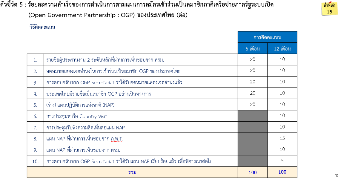• ร้อยละความสำเร็จ เป็นร้อยละของการดำเนินการตามแผนการสมัครเข้าร่วมเป็นสมาชิก OGP ของประเทศไทยตั้งแต่การเสนอคณะรัฐมนตรีพิจารณาเห็นชอบผู้ประสานงาน 2 ระดับหลักจนถึงการส่งแผน NAP ไปยัง OGP Secretariat พิจารณา รวม 10 ขั้นตอน