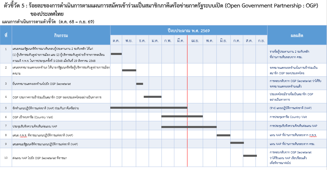 | ร้อยละความสำเร็จของการดำเนินการตามแผนการสมัครเข้าร่วมเป็นสมาชิกภาคีเครือข่ายภาครัฐระบบเปิด (Open Government Partnership : OGP) ของประเทศไทย | 0.00 (ร้อยละ) |