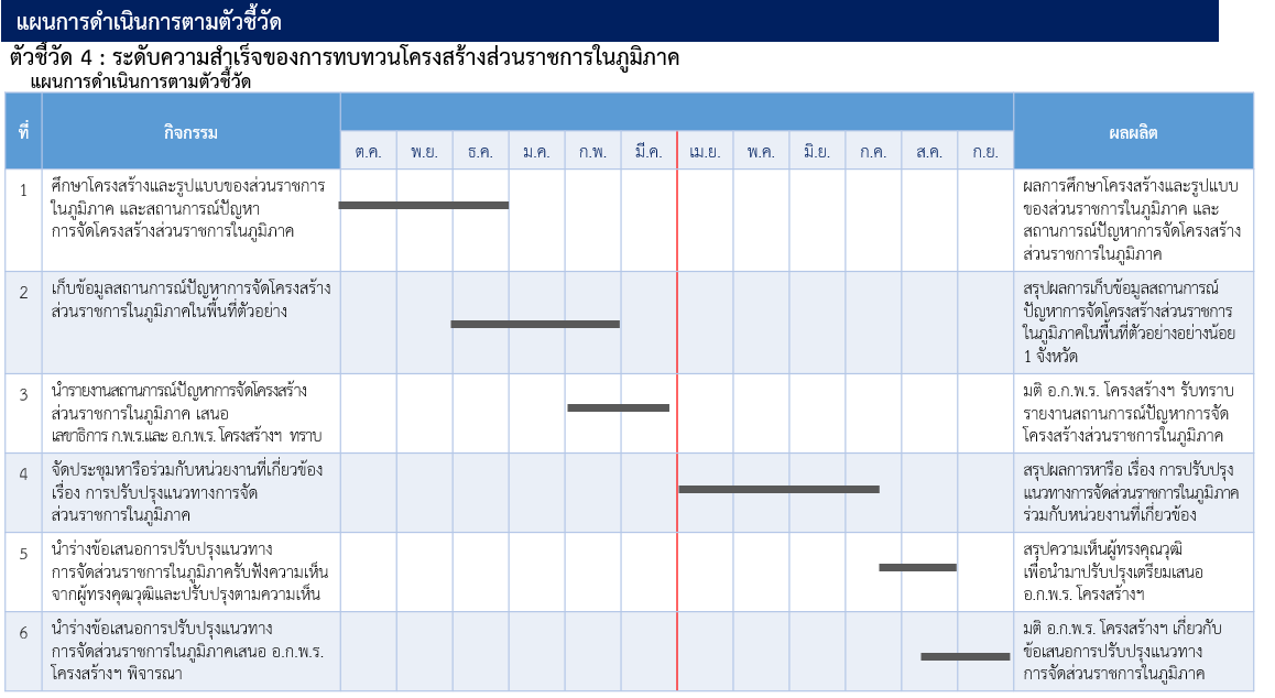 • สำนักงาน ก.พ.ร. จะดำเนินการศึกษาสถานการณ์ปัจจุบันเกี่ยวกับการจัดโครงสร้าง และบริบทของการปฏิบัติราชการของส่วนราชการในพื้นที่ เพื่อจัดทำข้อเสนอการการปรับปรุงแนวทางการจัดส่วนราชการในภูมิภาคเสนอต่อ อ.ก.พ.ร. เกี่ยวกับการทบทวนบทบาทภารกิจและปรับปรุงโครงสร้างของส่วนราชการ